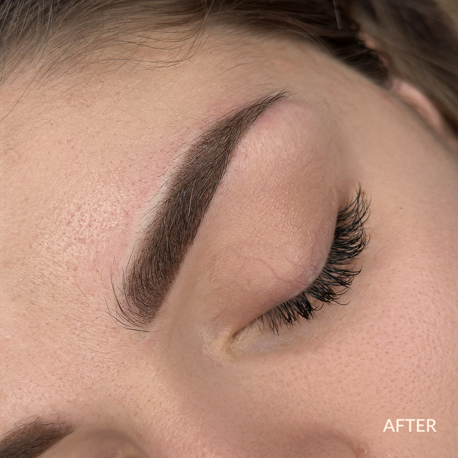Even, dense color with a subdued yet defined quality. Soft, smooth gradients without sharp lines or hair-like strokes form the natural eyebrows you've always wanted that nature never delivered. Artistry applied to the upper layers of the skin; it's a permanent technique with that 'no-makeup' makeup appearance that begins lightly at the base and gradually darker toward the tail. It's not hair-stroke imitation, it's a light, airy layer of color like eyeshadow.